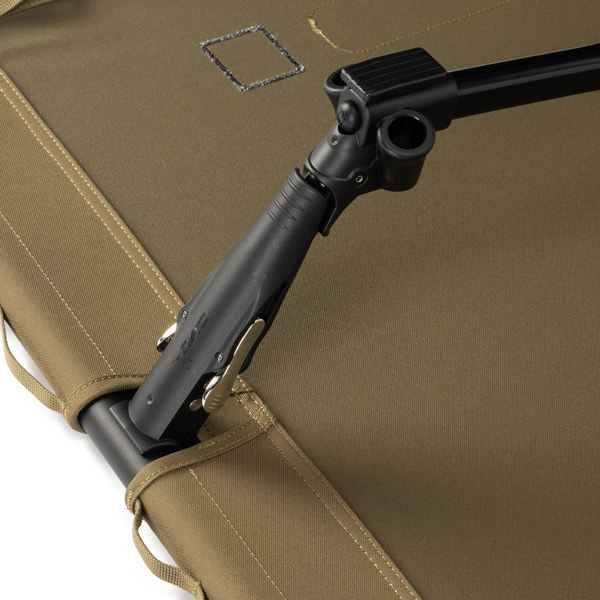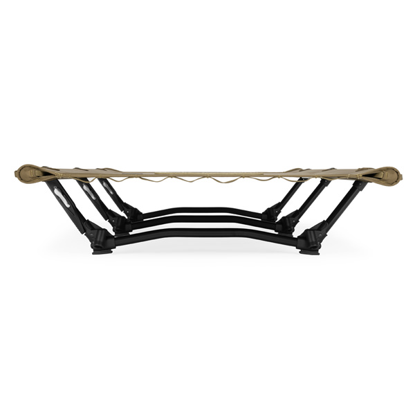 独自のロックレバー付き高強度アルミフレームで安定性を高め、組立、分解が簡単にできる軽量なロースタイルのタクティカルコットです。 優れた折りたたみシステムで容易に高剛性のコットを組み立てることが可能に。縁にループが付いており、カラビナでギアを吊るす事もできます。 別売りのコットレッグで、ハイコットにすることも可能です。耐荷重の145kgの範囲でならベンチのようにしてお使いいただくことも可能です。
